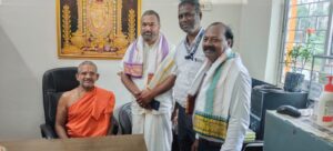 श्री दर्पण न्यूज, जमशेदपुर: बेंगलुरु से भुवनेश्वर होते हुए अयोध्या जाने के क्रम में श्री राम जन्मभूमि तीर्थ क्षेत्र के ट्रस्टी एवं उडुपी पेजावर मठ के पीठाधीश श्री श्री 108 श्री विश्व प्रसन्न तीर्थ स्वामीजी आंध्र भक्त श्री राम मंदिर, बिस्टुपुर पहुंचे। स्वामीजी अपने 30 शिष्यों के साथ मंदिर पहुंचे तो मंदिर कमेटी द्वारा बैंड-बाजे की धुनों के बीच चरण स्पर्श, चुनरी ओढ़ाकर एवं पुष्पमालाओं से भव्य स्वागत किया गया।